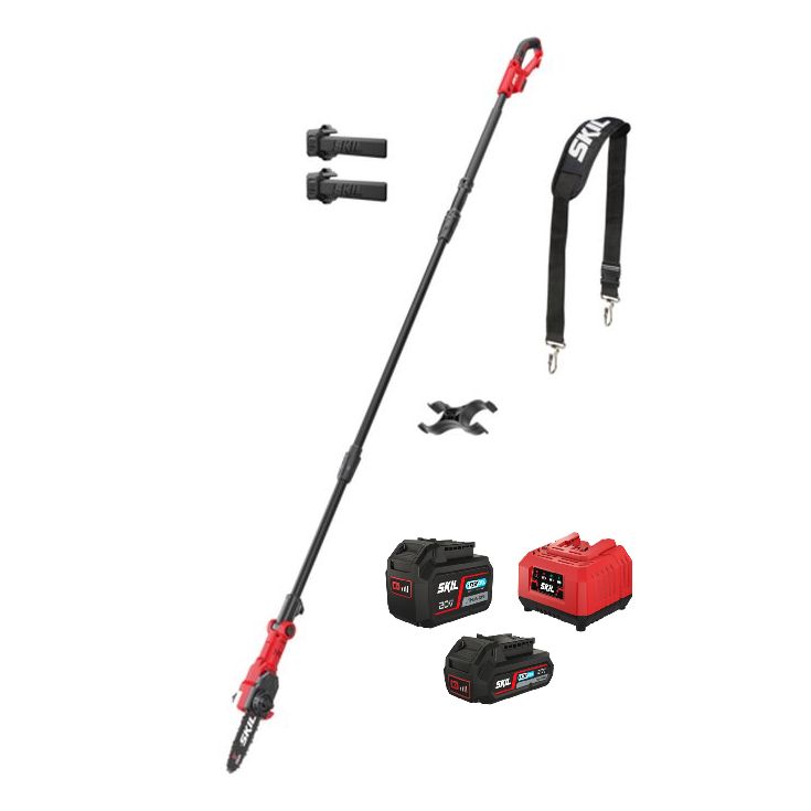 The long-handled cordless chainsaw is powered by a 20V Max battery and charger, which are also compatible with other Skil tools. Note: This product does NOT come with a battery or charger! The device has a three-year warranty for consumer use and a one-year warranty for professional use without registration.
