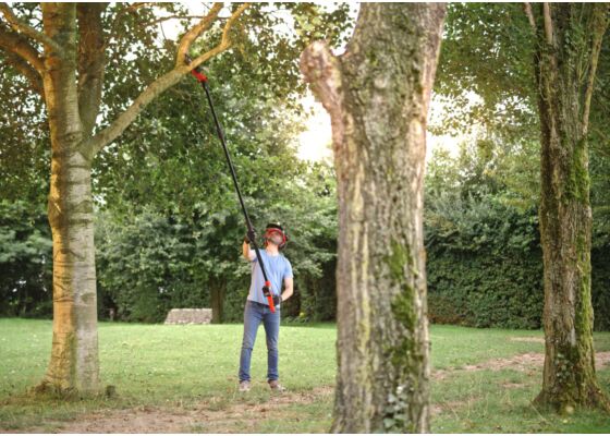 The Skil 0650 CA long-handle cordless pruning saw cuts tree branches efficiently and safely without climbing. The detachable three-meter telescopic handle reaches high, but doesn't take up much space in storage. The saw head swivels in eight positions, so you can prune branches accurately even in difficult places.