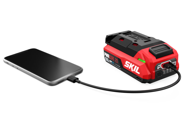 Kaksisuuntainen USB-C-lataus tuo joustavuutta: voit käyttää joko tavallista USB-C-laturia tai SKILin omaa PWRCORE 20™ -laturia. LED-merkkivalot kertovat selkeästi, lataatko vai puretko virtaa, ja akun varaustason ilmaisimesta näet latauksen tilanteen yhdellä silmäyksellä.